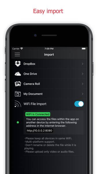 使用 VidaX,用户可以从 Dropbox 和 OneDrive 等云服务,以及相机胶卷和内部文档导入文件。该应用还提供 Wi-Fi 文件传输功能,并在导入时自动转换与设备不兼容的视频/音频。